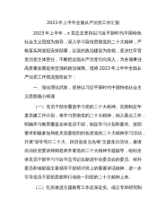 2023年上半年全面从严治党工作汇报2023年上半年,x党总支坚持以习近平新时代中国特色社会主义思想为指导,深入学习宣传贯彻党的二十大精神,严格落实局党组安排部署,以党的政治建设为统领,坚决扛牢管党治党主体责任,不断把全面从严治党引向深入,为各项事业高质量发展提供坚强的政治保障。现将2023年上半年全面从严治党工作情况报告如下:一、强化理论武装,坚持以习近平新时代中国特色社会主义思想凝心铸魂(一)党员干部全覆盖学习党的二十大精神。完善制定年度党建工作计划,将学习贯彻党的二十大精神,纳入重点工作,明确学习教育覆盖全体党员干部,制定学习计划和要求。按照要求积极参加局机关党委组织的各类党的二十大精神...