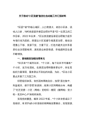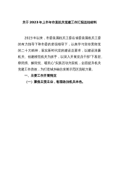 关于2023年上半年市直机关党建工作汇报总结材料2023年以来,市委直属机关工委在省委直属机关工委的有力指导下和市委的坚强领导下,认真学习宣传贯彻党的二十大精神,落实新时代党的建设总要求,以建设清廉机关、创建模范机关为抓手,以深入开展党员干部“下基层、察民情、解民忧、暖民心”实践活动为契机,全面提升机关党建工作质效,为打造城乡融合发展示范区贡献力量。一、主要工作开展情况(一)聚焦主责主业,彰显政治机关本色。一是旗帜鲜明讲政治。要求市直各单位研究部署每一项工作都要从政治上考量、在大局下行动。深入开展政治机关意识教育,把思想教育、政治监督、整改落实结合起来,引导机关基层党组织和党员干部将对党忠诚体...