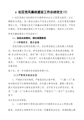 x社区党风廉政建设工作总结范文(1)x社区坚持以XXX新时代中国特色社会主义思想为指导,以主题教育为契机,深入落实全面从严治党主体责任,扎实开展党风廉政建设工作,不断强化党员干部廉洁自律意识和岗位责任意识,严抓作风建设,将党风廉政建设工作与业务工作相融合,现结合工作实际,将党风廉政建设工作总结如下:一、压实主体责任,强化思想教育(一)明确责任、强化监督党委定期讨论研究党建工作,及时贯彻落实上级党建工作新要求,制定党建工作计划,研究安排社区党建工作具体落实措施,明确各支部书记责任,落实"第一责任人"职责,强化党组织主体责任,认真履行“一岗双责”,对分管范围内党风廉政建设工作主动督促。不定期开展谈...
