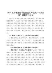 2024年乡镇党委书记全面从严治党“一岗双责”履职工作总结2024年,是我担任乡镇党委书记的第x年。在区委区政府的坚强领导下,我始终牢记“抓好党建是最大政绩”的理念,认真履行党委书记抓基层党建第一责任人职责,坚持“书记抓、抓书记”,以“全面从严治党”为统领,将“一岗双责”扛在肩上,抓在手上,落实在行动上。现将我个人2024年度履行全面从严治党“一岗双责”情况汇报如下,恳请各位领导批评指正。一、聚焦“主责主业”,扛起管党治党政治责任乡镇党委书记,既是“班长”,更是“领航人”。必须牢牢抓住“全面从严治党”这个“牛鼻子”,才能确保基层党组织始终沿着正确方向前进,才能为经济社会高质量发展提供坚强政治保...
