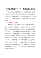 市局机关党委2023年一季度党建工作汇报为进一步加强基层党组织建设,夯实党建工作基础,强化日常监督管理,推进从严治党向纵深发展,市xx局机关党委根据市委直属机关工委安排部署,认真研究制定2023年一季度党建工作计划,全面完成一季度各项工作任务。现将工作完成情况报告如下:一、加强党员学习教育一是坚持把政治建设摆在首位,严格落实党组中心组学习、三会一课制度,研究制定每月学习计划,认真学习贯彻习近平新时代中国特色社会主义思想和党的xx大精神以及全国两会精神,学习习近平总书记重要讲话和指示批示精神以及中央和省市委重要会议、重要讲话精神。并认真学习新修订的《中国共产D章程》《党的xx大报告学习辅导百问》...