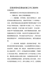 区税务局向区委组织部工作汇报材料区委组织部:现将我税务局工作有关情况向区委组织部作以汇报:一、聚焦主责,税务工作取得新成效(一)党建领航、补钙铸魂,强化引领“聚合力”。坚持把党的政治建设放在首位,紧贴学贯党的二十大精神这一主线,持续开展政治机关意识教育和“周四理论夜校”“XX青年论坛”等特色活动,专题开展“XX喜迎二十大,学史力行践初心”主题党课,打造“红帆X税”文化展厅、文化长廊,持续打牢干部思想政治根基。坚持“围绕税收抓党建,抓好党建促税收”的工作思路,落实市局“支部建在科所”要求,重新调整新设支部,举办首届“支部书记论坛”,开展“支部建设质量提升年”,持续巩固党支部标准化、规范化建设成果...
