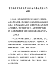 县市场监督管理局党支部2025年上半年党建工作总结2025年上半年,*县市场监督管理局党支部坚持以新时代中国特色社会主义思想为指导,深入学习贯彻党的二十大和二“十届三中全会精神,紧扣抓党建、强队伍、促监管、惠民”“生主线,以红盾先锋·”市监为民党建品牌为引领,推动党建与业务深度融合,为全县市场监管事业高质量发展提供了坚强政治保障。现将上半年党建工作情况总结如下。一、工作开展总体情况“今年以来,支部坚持围绕中心抓党建、抓好党建促业”务的工作思路,以政治建设为统领,以服务中心为导向,以队伍建设为支撑,全面落实党建工作责任制。上半年共召开支委会8次、党员大会3次、党小组会16次,开展主题党日活动6次...