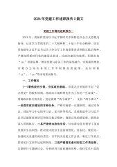 2024年党建工作总结及2025年工作计划【七篇】与2024年“党纪学习教育”专题党课讲稿11篇文合编供参考2024年党建工作总结及2025年工作计划一2024年,我局党组坚持以习近平新时代中国特色社会主义思想为指引,深入学习宣传贯彻党的二十大和二十届二中、三中全会精神,团结带领机关党员认真贯彻落实市委、省局党委关于抓机关党建工作的部署要求,不断创优党建品牌。现将2024年度党建工作情况总结和2025年工作计划报告如T:一、主要工作情况(一)抓理论学习,提升党员能力素质。始终坚持把政治建设摆在首位,坚持以习近平新时代中国特色社会主义思想为指引,将树立“四个意识”、坚定“四个自信”、做到“两个维...