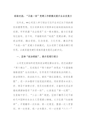 在2024年党建引领国有企业高质量发展年中推进会上的汇报发言尊敬的各位领导,同志们:**公司坚持以习近平新时代中国特色社会主义思想为指导,紧紧围绕“打造区域内建筑标杆企业”中心任务,持之以恒推进党建与业务工作深度融合,打造**特色党建品牌,引领广大干部职工群众以饱满的精神状态,跑出加速度、跑出新成效,推动公司迈过“生存线”、达到“发展线”。现将有关工作进展情况汇报如下:“党建+政治建设”,导航企业发展。强化理论武装。公司党委坚持把党纪学习教育作为推动工作的重要机遇和强大动力,先后组织中层干部读书班7天、基层党组织集中学习76次,党员进党校435人次,结合推动企业扭亏攻坚等方面存在的主要问题,组...