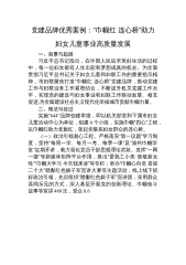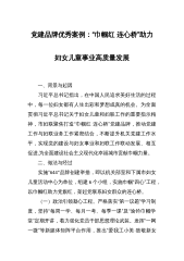 党建品牌优秀案例:“巾帼红连心桥”助力妇女儿童事业高质量发展一、背景与起因习近平总书记指出,在中国人民追求美好生活的过程中,每一位妇女都有人生出彩和梦想成真的机会。为全面贯彻习近平总书记关于妇女儿童和妇联工作的重要指示精神,市妇联聚焦打造“巾帼红连心桥”党建品牌,推动党建工作与妇联业务工作紧密结合,不断提升机关党建工作水平,实现党的建设与妇女事业和妇联工作联动发展、相互促进,为全面建设社会主义现代化幸福城市贡献巾帼力量。二、做法与经过实施“644”品牌创建举措,即以机关部室和下属市妇女儿童活动中心为单位,组建6个小组,实施巾帼“四心”工程,以巾帼红助力党旗红,架起党联系妇女群众的连心桥。(一)...