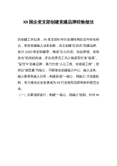 XX国企打造党建品牌经验做法 近年来,**党委以习近平新时代中国特色社会主义思想为指引,深入贯彻落实新时代党的建设总要求和组织路线,结合**市地域文化和国有企业政治属性,努力创建“映山红”党建品牌,以“五红五映”为主要框架,坚持把党的领导融入工厂治理各环节,坚持把党组织党员作用发挥贯穿到生产制造全过程,持续以高质量党建推动工厂高质量发展。 一、“一条主线”夯思想,以“党旗红”映向阳丹心 发扬“映山红”一片红心永向党的精神,以学习贯彻习近平新时代中国特色社会主义思想为主线,坚持把感党恩、听党话、跟党走融入到生产管理的方方面面,始终胸怀“国之大者”,与党中央同心同德、同向同行。坚持在学上下功...