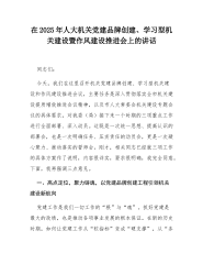 在2025年人大机关党建品牌创建、学习型机关建设暨作风建设推进会上的讲话同志们:今天,我们在这里召开机关党建品牌创建、学习型机关建设和作风建设推进会议,主要任务是深入贯彻落实全市机关建设提质增效推进会议精神,以及市人大常委会机关建设专题会议的具体要求,对我委(局)接下来一个时期的三项重点工作进行全面部署、深入动员。这既是一次统一思想、提高认识的部署会,也是一次明确任务、压实责任的动员会,更是一次凝心聚力、推动落实的誓师会。刚才,相关同志已经就三项工作的具体方案作了说明,内容很详实,要求很明确,我完全同意。下面,我再强调三点意见。一、高点定位,聚力铸魂,以党建品牌创建工程引领机关建设新航向党建工...