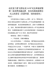 在区直工委“光荣在党50年”纪念章颁发暨第一批优秀党建品牌、党员先锋岗授牌仪式上的讲话(区委常委、组织部部长)同志们:今年是中国GC党成立xxx周年,在“七一”即将之际,区直工委在这里举行“光荣在党xx年”纪念章颁发暨第一批优秀党建品牌、党员先锋岗授牌仪式,具有十分重要的意义。在此,我代表区委向获得“光荣在党xx年”纪念章的老党员、向授牌的集体和个人表示热烈的祝贺!向奋战在全区各条战线上的广大GC党员,致以节日的问候!借此机会,我讲三个方面意见。一、不忘历史,方能行稳致远XXX总书记指出:“一切向前走,都不能忘记走过的路;走得再远、走到再光辉的未来,也不能忘记走过的过去,不能忘记为什么出发。”...