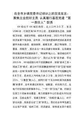 在全市乡镇党委书记培训上的交流发言:聚焦主业担好主责认真履行基层党建“第一责任人”职责XX镇位于XX城区南部,总人口约3.5万,党员1590名,行政区域56平方公里,是国家级生态镇、国家级卫生镇、省级文明镇、省级水美乡镇,2021年全市乡镇经济发展十强乡镇。近年来,XX镇党委始终把抓好基层党建作为最大政绩、最强保障、最硬支撑,通过“两保障、三覆盖、四规范”,逐步走出一条以党建引领发展、以党建保障发展的基层党建新路子。“两保障”稳人心。能否稳住村干部尤其是村书记队伍的“心”,我们认为“薪”是关键。早在2015年,XX镇就推行村干部薪酬改革,探索“基本工资+绩效工资”模式,建立村干部薪酬递增和村干...