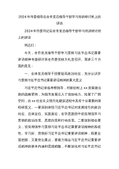 2024年市委领导在全市党员领导干部学习培训研讨班上的讲话2024年市委书记在全市党员领导干部学习培训研讨班上的讲话同志们:今天,全市党员领导干部学习贯彻习近平总书记重要讲话精神专题研讨班在市委党校大礼堂召开。我讲三个方面的意见:一、全体党员领导干部要提高政治站位,充分认识学习贯彻习近平总书记重要讲话精神的重大意义习近平总书记亲临考察指导,对新征程上xx发展做出新的战略擘画,为我市发展注入了强劲动力、拓展了广阔空间,在xx社会主义现代化建设进程中具有十分重要的里程碑意义。一要深刻体悟习近平总书记对发展指引的政治站位、总体定位、实践落位,在学思践悟中切实增强学习贯彻的政治自觉、思想自觉和行动自觉...