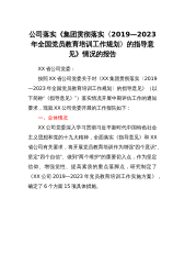 XX公司党委关于落实《XX集团贯彻落实〈2019—2023年全国党员教育培训工作规划〉的指导意见》情况的报告XX省公司党委:按照XX省公司党委关于对《XX集团贯彻落实〈2019—2023年全国党员教育培训工作规划〉的指导意见》(以下简称“《指导意见》”)落实情况开展中期评估工作的通知要求,现就XX公司党委开展的工作报告如下:一、总体情况XX公司党委深入学习贯彻习近平新时代中国特色社会主义思想和党的十九大精神,全面落实《指导意见》和XX省公司有关要求,将开展党员教育培训作为增强“四个意识”、坚定“四个自信”、做到“两个维护”的重要切入点,作为坚定信仰、增强党性、提高素质的重点落脚点,研究制定了《...
