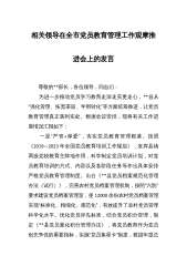 xxx贯彻落实《2019-2023年全国党员教育培训工作规划》实施情况中期报告加强党员教育培训是提升党员素质、增强队伍活力的有力措施,是加强党的建设的重要内容和途径。2019年以来,我镇党委严格按照《2019-2023年全国党员教育培训工作规划》的有关要求,及时制定下发了《xxx党委关于贯彻落实〈2019-2023年全国党员教育培训工作规划〉的实施意见》,通过丰富教育手段、注重优化方式、分层分级培育,着力增强党员教育培训工作的实效性。通过开展基层党支部书记培训、农村党员培训、新党员培训、党员就业技能培训、年轻党员培训、下岗失业党员培训等,全镇党员队伍整体素质得到明显提高,先锋模范作用得到进一...