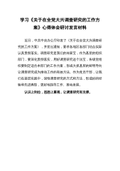 学习《关于在全党大兴调查研究的工作方案》心得体会研讨发言材料近日,中共中央办公厅印发了《关于在全党大兴调查研究的工作方案》,并发出通知,要求各地区各部门结合实际认真贯彻落实。调查研究是我们的传家宝,作为基层的组织部门,要深化贯彻落实,用好调查研究这个法宝,各级党组织要制定适合本部门的工作方案,形成大抓基层的鲜明导向让调查研究成为推动工作的有效方法。作为党员干部,让我们在基层实践中,深悟调查研究的方式和方法,形成好的经验和先进典型,更好地指导工作、推动发展。认识上到位,思想上重视,让调查研究有支撑。思想是行动的先导。各级党组织要想做好调查研究,要认识上到位,要在思想上对调查研究工作进行重视,各级...