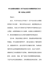 XX县党委全面落实《关于在全党大兴调查研究的工作方案》动员会上的讲话同志们:近日,中共中央办公厅印发了《关于在全党大兴调查研究的工作方案》。我们召开这次会议,就是要提高认识加强落实,为深入学习贯彻习近平新时代中国特色社会主义思想,全面贯彻落实XX大精神,在我县大兴调查研究工作,推动全面建设社会主义现代化国家开好局起好步。近年来,我县发展进入新时代,面临着各种新的问题和挑战。作为县委的领导班子,我们必须深入了解实际情况,把握发展方向,提出切实可行的解决方案,为推动县域经济社会持续健康发展提供有力支持。在这个过程中,调查研究工作的重要性不言而喻。调查研究是我们党的传家宝,是决策、实施、推广各项工作...