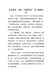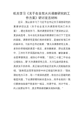 学习《关于在全党大兴调查研究的工作方案》心得体会研讨发言材料近日,中共中央办公厅印发了《关于在全党大兴调查研究的工作方案》,并发出通知,要求各地区各部门结合实际认真贯彻落实。调查研究是我们的传家宝,作为基层的组织部门,要深化贯彻落实,用好调查研究这个法宝,各级党组织要制定适合本部门的工作方案,形成大抓基层的鲜明导向让调查研究成为推动工作的有效方法。作为党员干部,让我们在基层实践中,深悟调查研究的方式和方法,形成好的经验和先进典型,更好地指导工作、推动发展。认识上到位,思想上重视,让调查研究有支撑。思想是行动的先导。各级党组织要想做好调查研究,要认识上到位,要在思想上对调查研究工作进行重视,各级...