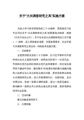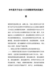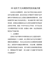 XX省关于大兴调查研究的实施方案在全党大兴调查研究,是以习近平同志为核心的党中央作出的重大部署,是在全党深入开展的学习贯彻习近平新时代中国特色社会主义思想主题教育的重要内容,是深刻领悟“两个确立”的决定性意义、坚决做到“两个维护”的具体实践,是推动全面建设社会主义现代化国家开好局起好步的有力举措。根据《中共中央办公厅印发〈关于在全党大兴调查研究的工作方案〉的通知》精神,结合我省实际,制定如下实施方案。一、总体要求坚持以习近平新时代中国特色社会主义思想为指导,全面贯彻党的二十大精神,深入贯彻习近平总书记视察**重要讲话重要指示,充分认识在全党大兴调查研究的重要意义,按照党中央确定的调研内容、方法...