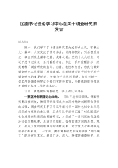 区委书记理论学习中心组关于调查研究的发言同志们:刚才,我们学习了《调查研究要力戒形式主义、官僚主义》篇章,大家交流了学习体会,讲得都很好,听后很受启发。调查研究是谋事之基、成事之道。党的十八大以来,习近平总书记发表一系列重要讲话、作出一系列重要指示,深刻阐释了调查研究的意义、内涵、途径和方法,为我们做好调查研究工作提供了根本遵循。学深悟透习近平总书记关于调查研究的重要论述,关键在于学思用贯通、知信行统一,切实用好调查研究这个我们党的传家宝,不断练好做好改革发展稳定各项工作的基本功。下面,围绕做好调查研究,讲几点认识体会。一要坚持创新理论为主线。习近平总书记强调,调查研究要注重实效,使调研的过程...