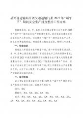 根据国务院、省、市、县和上级交通主管部门关于做好2025年“端午节”期间安全生产的部署和要求,结合我县交通运输行业安全生产工作实际,切实做好“端午节”期间安全生产工作,防范各类事故的发生,确保交通运输行业安全,特制订本方案。一、检查目的通过深入开展安全生产检查行动,进一步贯彻落实国务院、省、市、县和上级交通主管部门有关安全生产工作的部署和要求,扎实开展2025年度汛期暑期交通运输安全生产重大风险隐患排查整治行动、交通运输行业2025“隐患排查治理年”行动、安全生产治本攻坚三年行动等专项行动,深入开展安全生产排查整治工作,立足于治大隐患,防大事故,实现交通运输行业安全生产形势的持续稳定好转。二、...