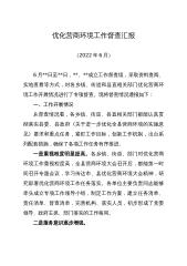 优化营商环境工作督查汇报6月××日至××日,××、××成立工作督查组,采取资料查阅、实地查看等方式,对各乡镇、街道和县直相关部门优化营商环境工作开展情况进行了专项督查。现将督查情况通报如下:一、工作开展情况从督查情况看,各乡镇、街道、县直相关部门都能认真贯彻落实县委、县政府《关于进一步优化全县营商环境的实施意见》要求和重点任务,紧盯工作目标,创新工作机制,出台系列配套措施,确保了各项工作任务有序推进。一是重视程度明显提高。各乡镇、街道、部门对优化营商环境工作重视程度高,全县营商环境大会召开后,都能第一时间召开专题会议,学习传达市、县优化营商环境大会精神,研究部署优化营商环境工作任务落实。各单位...