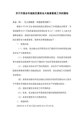 关于开展轨道交通工程施工领域安全生产专项督查检查的通知各有关单位: 为扎实推进我市轨道交通工程施工领域安全生产工作,切实解决和消除施工过程中的安全隐患及施工扰民问题,根据市政府要求,在全市轨道交通工程施工领域开展安全生产专项督查检查活动。 一、督查检查目标 按照全覆盖的要求,对全市轨道交通工程施工领域进行督查检查,督促企业落实主体责任,分析梳理薄弱环节和潜在风险点,全面排查治理安全隐患,切实提高安全管理水平。 二、督查检查时间和范围 自即日起至X月底,各安全生产责任主体针对全市轨道交通工程施工领域,突出近期投诉问题多发的重点标段/工区,进行全面督查检查。 三、督查检查方...