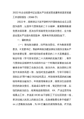 2022年企业党委书记全面从严治党述责述廉和抓基层党建工作述职报告(3566字)2022年,我坚持以习近平新时代中国特色社会主义思想为指导,认真学习贯彻党的二十大精神,紧紧围绕集团党委决策部署,坚决抗牢抓稳管党治党政治责任,全力推进全面从严治党向基层延伸,现将有关情况报告如下。一、履职情况(一)强化政治建设,抗牢政治责任。作为集团党委委员、X党委书记,我始终将政治建设摆在治落实全面从严党的首要位置,准时组织收听收看党的二十大直播盛况,制定印发《学习宣传党的二十大精神的实施方案》,将学习贯彻会议精神作为当前和今后一个时期的首要政治任务确保全体干部职工在政治立场、政治方向、政治原则上同党中央保持高...