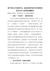 咸宁供电公司党委书记、副总经理乔柏在市纪委四届四次全会上的述职述廉报告根据会议要求,现在我向大会作述职述廉报告。一、坚持“一岗双责”,确保责任到位作为公司落实党风廉政建设责任制的第一责任人,我始终把党风廉政建设摆在重要位置,严格贯彻“四个亲自”,认真履行“一岗双责”。一是健全责任体系。每年年初分解下达领导班子成员和部门党风廉政建设责任指标督促所属各单位党组织层层分解并签订责任书,变“软任务”为“硬指标”,将党风廉政建设与企业主营业务工作同部署、同落实、同检查、同考核。二是强化监督检查。依据公司党风廉政建设责任制年度考核评价方案,我亲自带队参与以现场检查、查阅资料、班子成员述廉、民主测评等为主要...