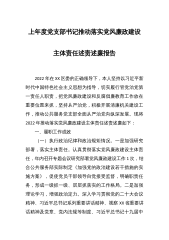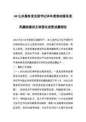 XX公共服务党支部书记本年度推动落实党风廉政建设主体责任述责述廉报告2022年在XX区委的正确领导下,本人坚持以习近平新时代中国特色社会主义思想为指导,切实履行管党治党第一责任人职责,把党风廉政建设和反腐倡廉教育工作放在重要位置来抓,坚持从严治党,积极开展清廉机关建设工作,推动公共服务党支部全面从严治党向纵深发展。现将2022年推动落实党风廉政建设主体责任述责述廉如下:一、履职工作成效(一)执行政治纪律和政治规矩情况。一是加强研究部署落实主体责任。认真贯彻落实党风廉政建设主体责任,年内召开专题会议研究部署党风廉政建设工作1次,结合公共服务部实际制定《加强党的政治建设若干措施的实施方案》,促使党...