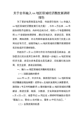 关于全市融入xx地区双城经济圈发展调研报告为了更好地贯彻落实市委、市政府印发的《xx市融入xx地区双城经济圈发展行动方案》,今年x月以来,xx市政协采取市县联动、内外结合的方式,组织x个专题调研组和xx个县级政协调研组,通过实地走访、座谈交流、查阅资料、网络调查、外出考察和邀请省直有关部门负责人咨询论证等方式,就我市融入xx地区双城经济圈开展调查研究并形成详尽调研报告。市政协于x月xx日举行市长与市政协委员座谈会,政协委员们充分发挥主体作用,围绕进一步融入xx地区双城经济主题,多层次多角度提出意见建议,切实履行政治协商、民主监督、参政议政职能。一、融入xx地区双城经济圈的现实意义(一)国家战略...