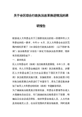 关于全区综合行政执法改革推进情况的调研报告根据省人大常委会关于三级联动执法的统一部署和市人大常委会的统一要求,今年6-8月,区人大常委会在全区范围内组织开展了《XX省综合行政执法条例》(以下简称“条例”)执法检查及“大综合一体化”行政执法改革调研。现将有关情况报告如下:一、基本情况区人大常委会对《条例》执法检查高度重视。今年5月,根据省、市人大常委会确定的《条例》执法检查重点、步骤区人大常委会第三次主任会议通过了我区关于开展《条例》执法检查的实施方案。实施检查前,各执法检查小组对执法检查重点内容进行了专题学习,牵头工委还集体参加了由市人大常委会组织的《条例》专题解读培训。为了确保执法检查真正取...