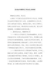 在2024年度防汛工作会议上的讲话尊敬的各位领导、同志们:大家好!今天我们在这里召开防汛工作会议,目的是对当前防汛形势进行深入分析,全面部署防汛工作任务,动员大家迅速行动起来,确保安全度汛。防汛工作事关人民群众生命财产安全,事关经济社会发展大局,我们必须高度重视,切实增强责任感和使命感。一、提高政治站位,增强思想认识(一)要充分认识到防汛工作的极端重要性。防汛工作直接关系到人民群众的生命和财产安全,是保障社会稳定和经济发展的重要基础。在面对洪水等自然灾害时,有效的防汛措施能够最大程度地减少人员伤亡和财产损失,维护社会秩序的稳定。同时,防汛工作的顺利开展也有利于保障基础设施的正常运行,为经济发展...