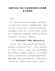县长在2025年乡镇(街道)防汛抗旱工作部署会上的讲话同志们:防汛抗旱,是守护人民生命财产安全的坚实壁垒,是保障经济社会平稳发展的重要基石。近年来,气候变化带来的极端天气事件频发,暴雨、洪水、干旱等灾害给我们的生产生活带来了诸多挑战。2025年的防汛抗旱形势依然严峻复杂,据气象部门预测,今年夏季降水量较常年偏多,局部地区可能发生较大洪水,同时部分乡镇(街道)也可能面临阶段性干旱。面对即将到来的考验,我们必须以高度的责任感和使命感,全力以赴做好防汛抗旱各项工作。一、未雨绸缪,下好风险预判“先手棋”古人云:“凡事预则立,不预则废。”防汛抗旱工作,准确的风险预判是前提。只有提前洞察潜在的风险隐患,才...