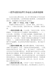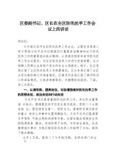 区委副书记、区长在全区防汛抗旱工作会议上的讲话同志们:今天我们召开全区防汛抗旱工作会议,主要任务是深入学习贯彻习近平总书记视察四川重要讲话精神和关于防汛抗旱工作的重要指示批示精神,认真落实国家和省市防汛抗旱工作会议要求,对全区防汛抗旱工作进行安排部署,全力保障人民群众生命财产安全和社会大局稳定。刚才,区应急局汇报了全区防汛抗旱工作部署情况,区水务局汇报了全区水旱灾害防御工作准备情况,区黄河河务局汇报了黄河防汛工作准备情况,大家讲得都很好,关键要抓好落实。下面,讲三点意见。一、认清形势,提高站位,切实增强做好防汛抗旱工作的思想自觉、政治自觉和行动自觉习近平总书记高度重视防汛抗旱工作,多次作出重要...