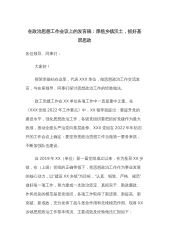 在政治思想工作会议上的发言稿:厚植乡镇沃土,抓好基层思政各位领导、同事们:大家好!很荣幸能站在这里,代表XXX单位,做思想政治工作交流发言,与在座领导、同事们探讨思想政治工作的经验做法。政工党建工作在XX单位各项工作中一直是重中之重。在《XXX党组2022年工作要点》中,XX领导就提出:要提升党的建设水平,强化思想政治工作,各级党组织要把抓好党建作为最大政绩,推动全面从严治党向基层延伸。XXX党组在2022年年初召开的工作会议上确定:要坚持把政治思想工作当做第一要务来抓,不断加强队伍建设。自2019年XX(单位)新一届党组成立以来,作为基层XX乡镇,在(上级)党组的正确带领下,把思想政治工作作...