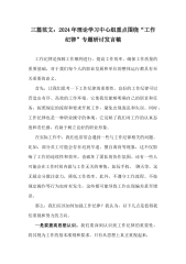 2024年党纪学习教育严守党的六大纪律(政治纪律、组织纪律、廉洁纪律、群众纪律、工作纪律、生活纪律)研讨发言稿1650字范文习近平总书记指出,年轻干部一定要有清醒的认识,经常对照党的理论和路线方针政策、对照党章党规党纪、对照初心使命,看清一些事情该不该做、能不能干,守住拒腐防变的防线。年轻干部生逢伟大时代,是党的国家事业发展的生力军,要以党的政治纪律、组织纪律、廉洁纪律、群众纪律、工作纪律、生活纪律为行动准则,时刻自重自省,扣好廉洁从政的“第一粒扣子”,努力成为党和人民忠诚可靠的干部。以政治纪律为“保障”,做到对党忠诚“不动摇”。政治纪律是党的所有纪律中最重要、最根本、最关键的纪律,是各级党组...