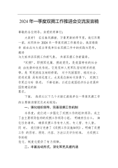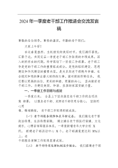 2024年一季度老干部工作推进会交流发言稿尊敬的各位领导,尊贵的嘉宾,辛勤的老干部们:大家上午好!在这春意盎然、生机勃发的美好时节,我们满怀喜悦,汇聚于此,共同见证一季度老干部工作取得的丰硕成果,深入剖析存在的问题,科学谋划下一阶段工作部署。老干部工作是党的干部工作的重要组成部分,是党的组织建设、思想建设和作风建设的重要内容,是关系到老干部晚年幸福、社会稳定和党的事业薪火相传的大事。面对新的形势任务,我们要以更高的站位、更实的举措、更强的决心,坚决做好老干部工作,为建设美丽、和谐、宜居的家园贡献力量。一、一季度工作回顾与成效一季度以来,全县上下坚决落实老干部工作的各项决策部署,以服务老干部、发...