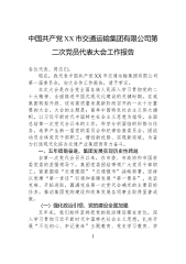 中国共产党XX市交通运输集团有限公司第二次党员代表大会工作报告各位代表、同志们:现在,我代表中国共产党XX市交通运输集团有限公司第一届委员会,向大会作工作报告,请予审议。本次大会是在全党全国各族人民深入学习贯彻党的二十大精神、全面推进中国式现代化建设的关键时期,在我集团转型升级、迈向高质量发展新阶段召开的一次十分重要的大会。大会的主题是:高举中国特色社会主义伟大旗帜,以习近平新时代中国特色社会主义思想为指导,全面总结第一次党代会以来的工作,科学分析面临的形势与任务,选举产生新一届党的委员会和纪律检查委员会,团结动员全体党员干部职工,增创新优势、实现新突破,为奋力打造现代化综合交通产业集团而努力...