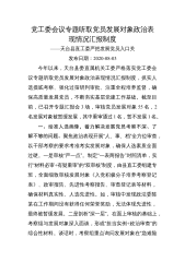 党工委会议专题听取党员发展对象政治表现情况汇报制度——天台县直工委严把发展党员入口关发布日期:2020-08-03今年以来,天台县委直属机关工委严格落实党工委会议专题听取党员发展对象政治表现情况汇报制度,抓实人选摸底考察、强化过筛研判审批、注重全程培养监督,确保高质量发展党员,不断夯实基层党建工作基础。截至目前,已召开专题汇报会3场,审核党员发展对象55名,2名发展对象被暂缓发展,其中重审通过1名,暂不发展1名。一、绘准人选画像,着力解决发展党员考察不深、了解不够的问题。聚焦政治表现开展“人、事、档”全方位审查,以干部考察的要求考准考实发展对象,确保人选素质全面过硬。一是审核“严一点”。制定“...