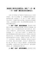 街道党工委书记交流发言:深化“一月一课一片一实践”激发党员队伍新活力为深入学习贯彻习近平新时代中国特色社会主义思想和党的二十届三中全会精神,进一步增强基层党组织政治功能和组织功能,我街道以“一月一课一片一实践”主题党日活动为抓手,全面提升组织生活质量,推动党员在学思践悟中凝心,在为民服务上聚力,真正将党的理论讲深讲细、将基层治理抓牢抓实。一、讲好“一堂课”,激发党员新动能。我街道党工委紧跟党中央和省市区委最新决策部署,紧扣时代发展脉搏,围绕党的二十届三中全会精神形成党工委书记带头讲、联村(社区)干部接力讲、支部书记示范讲、普通党员跟着讲的良好氛围,从“一人说”变成“大家讲”,以“微党课”形式推...