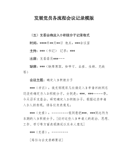 发展党员各流程会议记录模版(五)支委会确定入D积极分子记录格式时间:****年**月**日地点:***会议室主持:***(书记)记录:***出席:支委委员***……缺席:***(缺席原因,如学习、出差、生病、无故等)会议主题:确定入D积极分子***(书记):我支部现有几位递交入D申请书的同志还没有确定为入D积极分子,分别是:***、***………等,今天召开支委会,研究确定入D积极分子,根据这些申请入D人的表现,请各位发表意见:***(支委):……………我同意把***、***同志列为本期的入D积极分子。[谈对这些入D申请人的政治、思想、工作、学习等方面表现情况以及本人意见]***(支委):………...