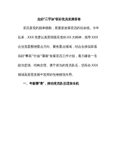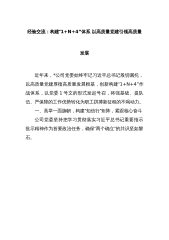 经验交流:构建“1+N+4”体系以高质量党建引领高质量发展近年来,*公司党委始终牢记习近平总书记殷切嘱托,以高质量党建厚植高质量发展根基,创新构建“1+N+4”作战体系,以党委1号文的形式发起号召,将强基础、提队伍、严保障的工作优势转化为职工拼搏新征程的不竭动力。一、高举一面旗帜,构建“知信行”矩阵,紧跟核心奋斗公司党委坚持把学习贯彻落实习近平总书记重要指示批示精神作为首要政治任务,确保“两个确立”的共识坚如磐石。提站位,及时学习跟进。深入贯彻“第一议题”制度,将习近平总书记重要讲话重要指示批示精神作为党委会、党委理论学习中心组、基层党组织月度要点的重要学习事项纳入干部培训、党员轮训、发展党员...