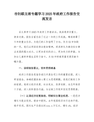 市妇联主席专题学习2025年政府工作报告交流发言在认真学习2025年政府工作报告后,我深感责任重大、使命光荣。报告全面总结了过去一年的工作成就,精准部署了今年的重点任务,为我们的工作指明了方向。作为XX市妇联的一员,我们必须深刻领会报告精神,将其转化为推动妇女事业发展的强大动力,以更加坚定的决心、更加有力的举措,为妇女儿童的幸福生活努力奋斗,为XX市的高质量发展贡献巾帼力量。一、深研报告要义,筑牢思想根基政府工作报告是指导我们开展各项工作的重要依据。深入研读报告,准确把握其核心要义与思想精髓,是我们做好工作的前提。我将从经济发展、社会民生、改革创新、生态环保四个方面,深入剖析报告内涵,为后续工...