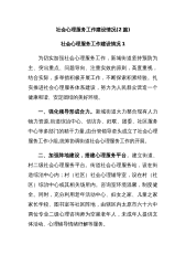 社会心理服务工作建设情况(2篇)社会心理服务工作建设情况1为切实加强社会心理服务工作,新城街道坚持预防为主、突出重点、问题导向、注重实效的原则,高度重视,结合实际,多举措积极开展工作,不断探索积累经验。扎实推进社会心理服务体系建设,努力为人民群众营造一个健康和谐、安定团结的美好环境。一、强化领导形成合力。新城街道大力整合现有人力物力资源,街道综治中心、信访办、妇联、团委、社区服务中心等多部门的精干力量,由分管领导牵头成立了社会心理服务工作小组,统筹协调街道社会心理服务工作的开展。二、加强阵地建设,搭建心理服务平台。建立街道、村二级社会心理服务平台。街道社会心理服务站,设在街道综治中心内;村(社...