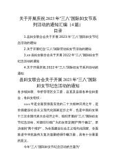 XX区直机关妇联关于全区开展2022年“三八”国际妇女节纪念活动的通知xx、xx各单位妇委会、妇女联合会、妇女小组:2022年是进入全面建设社会主义现代化国家、向第二个百年奋斗目标进军新征程的重要一年,是党的二十大召开之年。组织开展好2022年“三八”国际妇女节纪念活动,对引领广大妇女更加自觉拥护“两个确立”,做到“两个维护”,听党话跟党走,争做伟大事业的建设者、文明风尚的倡导者、敢于追梦的奋斗者具有重要意义。现就开展2022年“三八”国际妇女节纪念活动通知如下。一、突出主题,把学习宣传党的创新理论摆在首要位置今年“三八”国际妇女节纪念活动以“强国复兴有我”为主题,引领广大妇女巾帼心向党,喜迎...