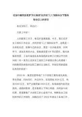 绽放巾帼英姿逐梦“百亿集团”在庆祝“三八”国际妇女节暨表彰会议上的讲话各位女职工、同志们:大家上午好!人间最美三月天,春花烂漫展新颜。今天,我们召开女工组织工作会议,共同庆祝“三八”国际妇女节,这既是一次表彰先进、鼓舞斗志的会议,更是一次共叙友情、共同学习、谋划未来的大会。受集团党委XX书记委托,我代表集团党委、工会向奋战在各条战线的女职工们致以节日的问候!向一直关心支持女工组织工作者致以衷心的感谢!向刚刚受到表彰的女职工建功立业标兵、和谐文明家庭致以热烈的祝贺!2022年,集团党委带领广大干部职工聚焦领先奔跑、率先突破,同向同行、共识共为,实现营收XXX亿元、利润XXX亿元,资产总额突破XX...