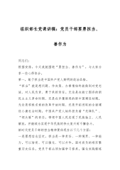 党纪学习教育专题党课:认清形势保持定力争做勤廉从政的表率(第三部分)同志们:按照区委党纪学习教育工作安排,要求我在这里给同志们讲一堂廉政党课,今天党课的主题是“认清形势、保持定力,争做勤廉从政的表率”,希望通过党课,让大家对十八大以来党风廉政建设和反腐败斗争形势有更深的理解,在面对错误思想、错误言论时能保持定力、自觉抵制,按照新时期优秀党员干部的标准做勤政廉政的表率。第三部分:不忘初心,争做新时期的优秀党员干部不同历史时期,对干部德才的具体要求有所不同。革命战争年代,对党忠诚、英勇善战、不怕牺牲的干部,就是好干部。社会主义革命和建设时期,懂政治、懂业务、又红又专的干部,就是好干部。改革开放初期...