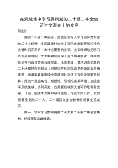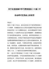 关于在党组集中学习贯彻党的二十届二中全会研讨交流会上的发言同志们:党的二十届二中全会,是在全党深入学习宣传贯彻党的二十大精神、全面建设社会主义现代化国家开局起步的关键时刻召开的一次十分重要的会议。会议对继续把学习宣传贯彻党的二十大精神引向深入提出明确要求,强调要推动学习宣传贯彻往深里走、往实里走,要求切实把党的二十大精神落实到位;对坚定不移深化改革开放提出明确要求强调要紧紧围绕全面建设社会主义现代化国家的目标,推出一批战略性、创造性、引领性改革举措,加强改革系统集成、协同高效,在重要领域和关键环节取得新突破。下面,围绕本次集中研讨主题,结合实际工作,就贯彻落实党的二十大、二十届历次全会精神作简...