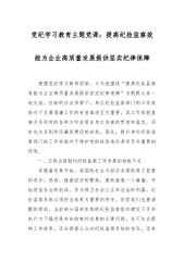 党纪学习教育主题党课:提高纪检监察效能为企业高质量发展提供坚实纪律保障 根据党纪学习教育安排,今天我围绕“提高纪检监察效能为企业高质量发展提供坚实纪律保障”为题跟大家一起交流。在新的社会形势下,单位纪检监察部门的工作效能对于反腐倡廉工作的有效推进至关重要。其工作效能直接关系到党的各种方针政策在单位内部的贯彻和落实,同时也关系到党风廉政建设的成效。因此,提升单位纪检监察部门的工作效能对于维护党的执政地位具有至关重要的作用。 一、正视当前制约纪检监察工作发展的短板不足 伴随着改革开放,我国的社会与经济发展取得了显著的进步。然而,随着经济的繁荣,腐败就像一个毒瘤,开始侵蚀社会的机体。作为捍卫社...