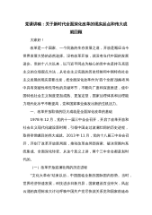 二十大主题党课讲稿:关于新时代全面深化改革的现实起点和伟大成就回顾大家好!改革是一个国家、一个民族的生存发展之道,开放是顺应当今世界发展大势的必然选择。没有改革开放,就没有当代中国的发展进步。党的十八大以来,以习近平同志为核心的党中央坚持马克思主义的立场观点方法,从社会主义实践的历史经验和中国特色社会主义发展的现实需要出发,把全面深化改革作为“四个全面”战略布局中具有突破性和先导性的关键环节,不断向广度和深度推进,使中国特色社会主义制度更加成熟、更加定型,国家治理体系和治理能力现代化水平不断提高,党和国家事业焕发出新的生机活力。一、改革开放取得的巨大成就是全面深化改革的基础1978年12月,党...