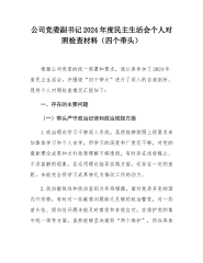 市工业园区党工委书记2024年民主生活会个人对照检查发言材料(四个带头)根据市委和市纪委机关、市委组织部《关于开好xxxx年度县以上党和国家机关党员领导干部民主生活会的通知》要求,我紧扣本次民主生活会主题,严格对照“四个带头”重点查摆问题的要求,按照“四必谈”的要求,与各班子成员进行了沟通交流,与分管部门负责人、各支部书记开展了谈心谈话,征集了一些意见和建议。现将具体情况汇报如下:一、上年度民主生活会整改落实情况(一)学习贯彻新时代中国特色社会主义思想方面。一是制定学习计划,做好领学促学。坚持把学习贯彻中国特色社会主义思想作为首要政治任务,第一时间组织传达学习党的二十大、二十届三中全会精神,制...